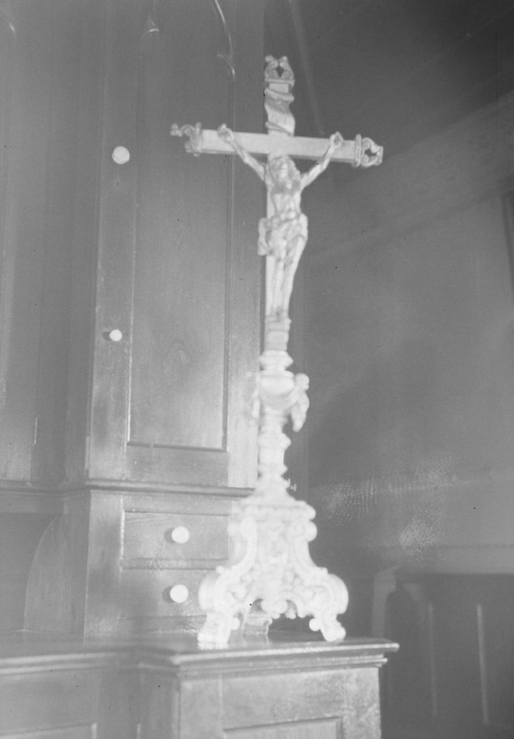Batiscan, Champlain - Église - Crucifix du maître-autel, exécuté en 1741 par les frères Levasseur, 1938, Archives nationales à Québec, Fonds ministère de la Culture et des Communications, (03Q,E6,S8,SS1,SSS208,D938), Gérard Morisset.