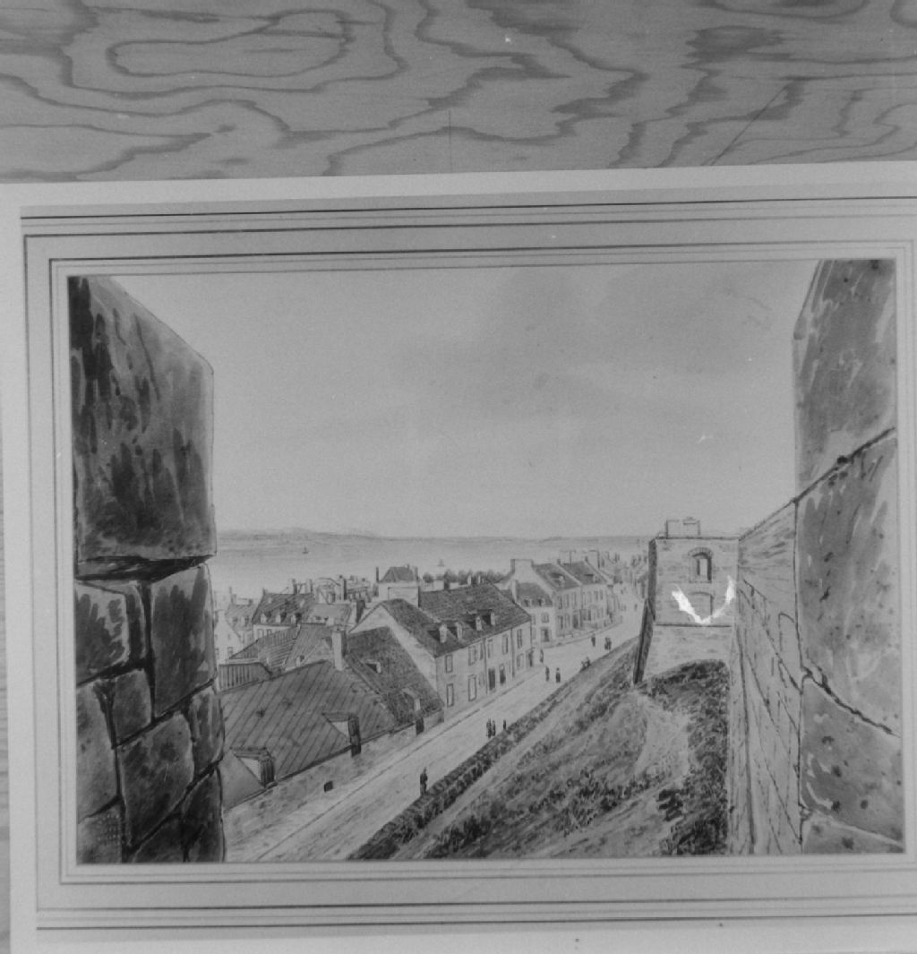 La Malbaie, Charlevoix est - Manoir Richelieu - « La Ville basse de Québec vue du bastion de l'artillerie », 1957, Archives nationales à Québec, Fonds Ministère de la Culture et des Communications, (03Q,E6,S8,SS1,SSS255,D1052), Jean-Paul Morisset.