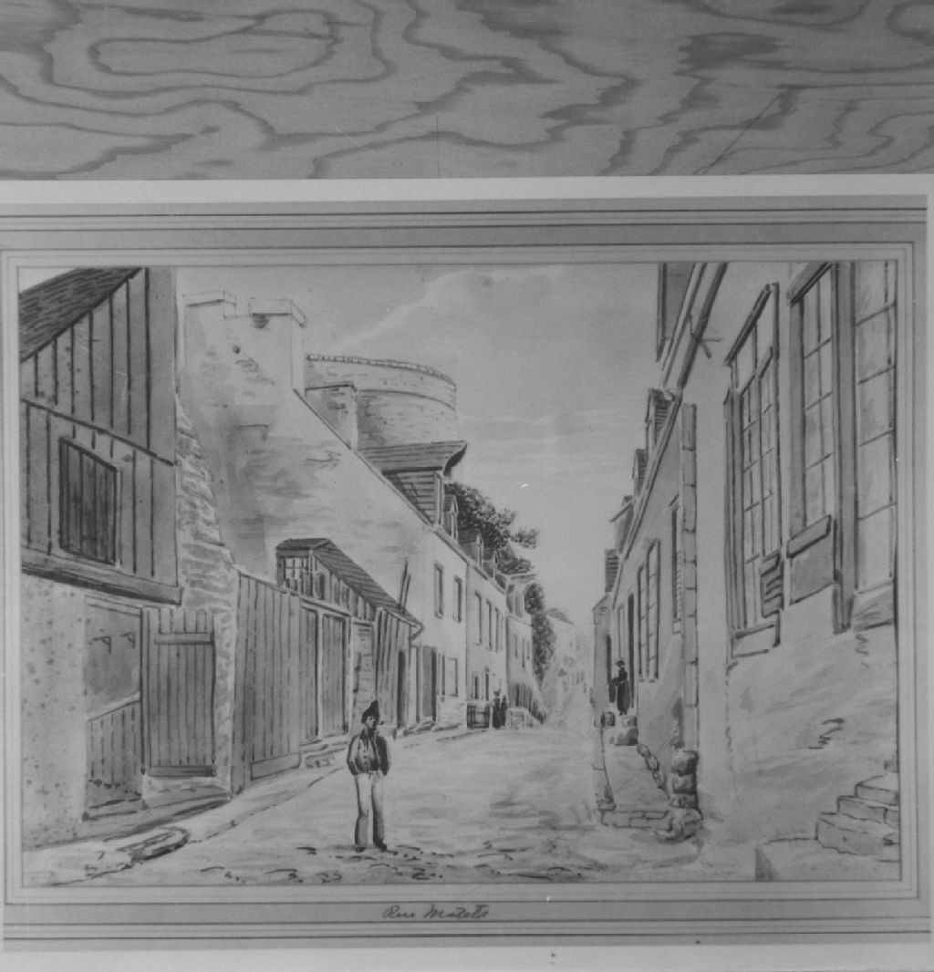 La Malbaie, Charlevoix est - Manoir Richelieu - « Québec: la rue du Sault-au-Matelot et le bastion du chien », aquarelle de James Pattison Cockburn (vers 1830), 1957, Archives nationales à Québec, Fonds ministère de la Culture et des Communications, (03Q,E6,S8,SS1,SSS255,D1054), Jean-Paul Morisset.