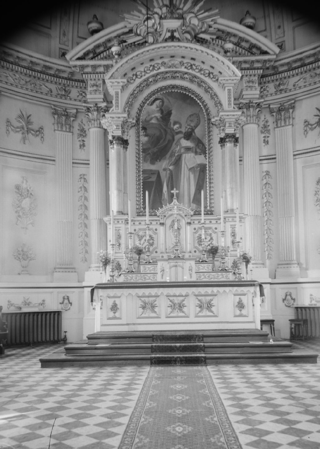 Saint-Anselme, Dorchester - Église - Fragment du retable, maître-autel en bois sculpté et tableau coupé, 1944, Archives nationales à Québec, Fonds ministère de la Culture et des Communications, (03Q,E6,S8,SS1,SSS392,D1669), Gérard Morisset.