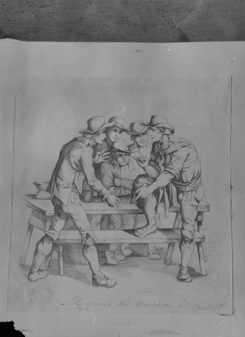 Montréal - Bibliothèque municipale, Album Viger - Dessin au crayon représentant cinq hommes près d'une table par Robert-Shore-Milnes Bouchette