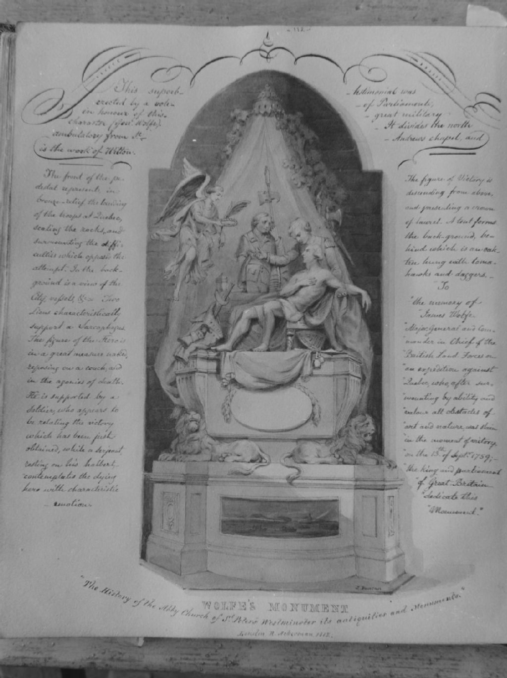 Montréal - Bibliothèque municipale, album Viger - « Le monument de Wolfe dans l'abbaye de Westminster », [1944], Archives nationales à Québec, Fonds ministère de la Culture et des Communications, (03Q,E6,S8,SS1,SSS548,D2141), Gérard Morisset.