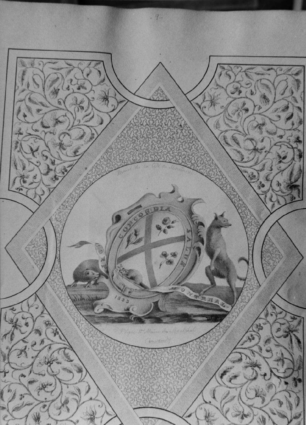 Montréal - Bibliothèque municipale, album Viger - Armes de la ville de Montréal composées par Jacques Viger (1833), [1944], Archives nationales à Québec, Fonds ministère de la Culture et des Communications, (03Q,E6,S8,SS1,SSS548,D2153), Gérard Morisset.