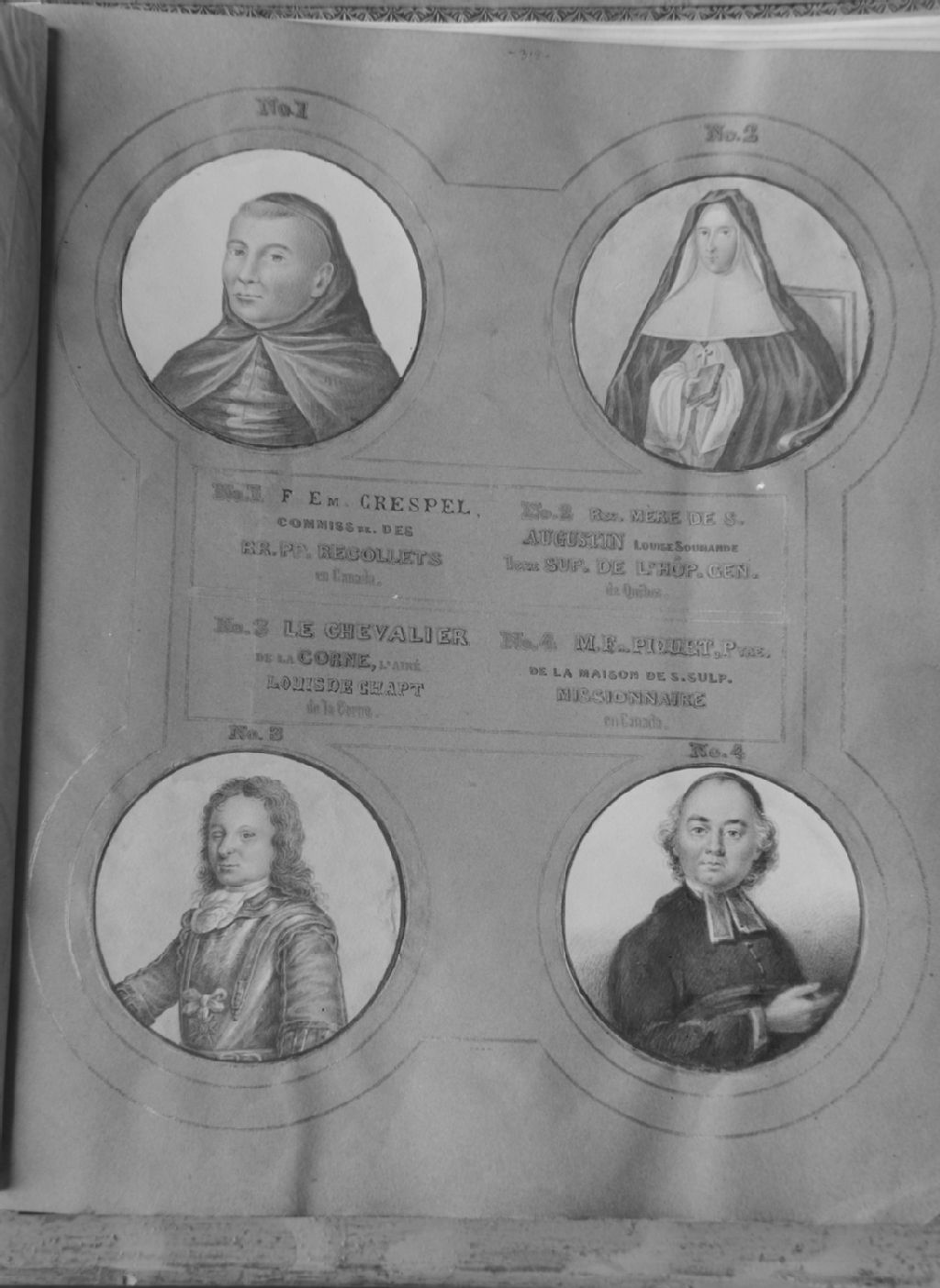 1- Père Emmanuel Crespel, d'après le portrait conservé dans la collection la veuve Mme Siméon Grondin2- Mère Louise Soumande de Saint-Augustin, d'après Michel Dessailliant dit Richeterre3- Lacorne de Saint-Luc, d'après un portrait peint provenant de Mme Jacques Viger4- L'abbé Piquet, d'après le portrait du presbytère d'Oka