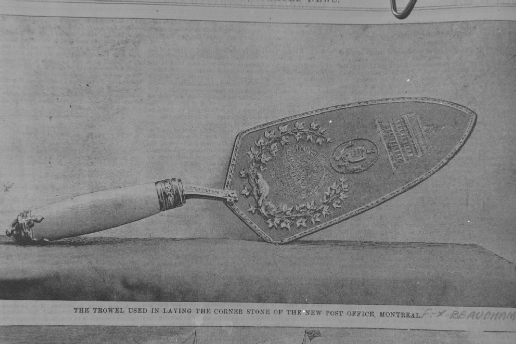 Montréal, Île de Montréal - Bureau de poste - Truelle en argent faite par François-Xavier Beauchamp qui a servi à la pose de la première pierre du Bureau de Poste, [1951], Archives nationales à Québec, Fonds ministère de la Culture et des Communications, (03Q,E6,S8,SS1,SSS551,D2218), Gérard Morisset.