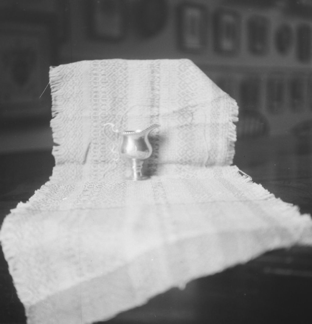 Montréal, Île de Montréal - Collection Birks - Aiguière baptismale en argent exposée au Château de Ramezay à l'été 1955. Poinçon de Johannès Schindler., [1955], Archives nationales à Québec, Fonds ministère de la Culture et des Communications, (03Q,E6,S8,SS1,SSS574,D2540), Gérard Morisset.