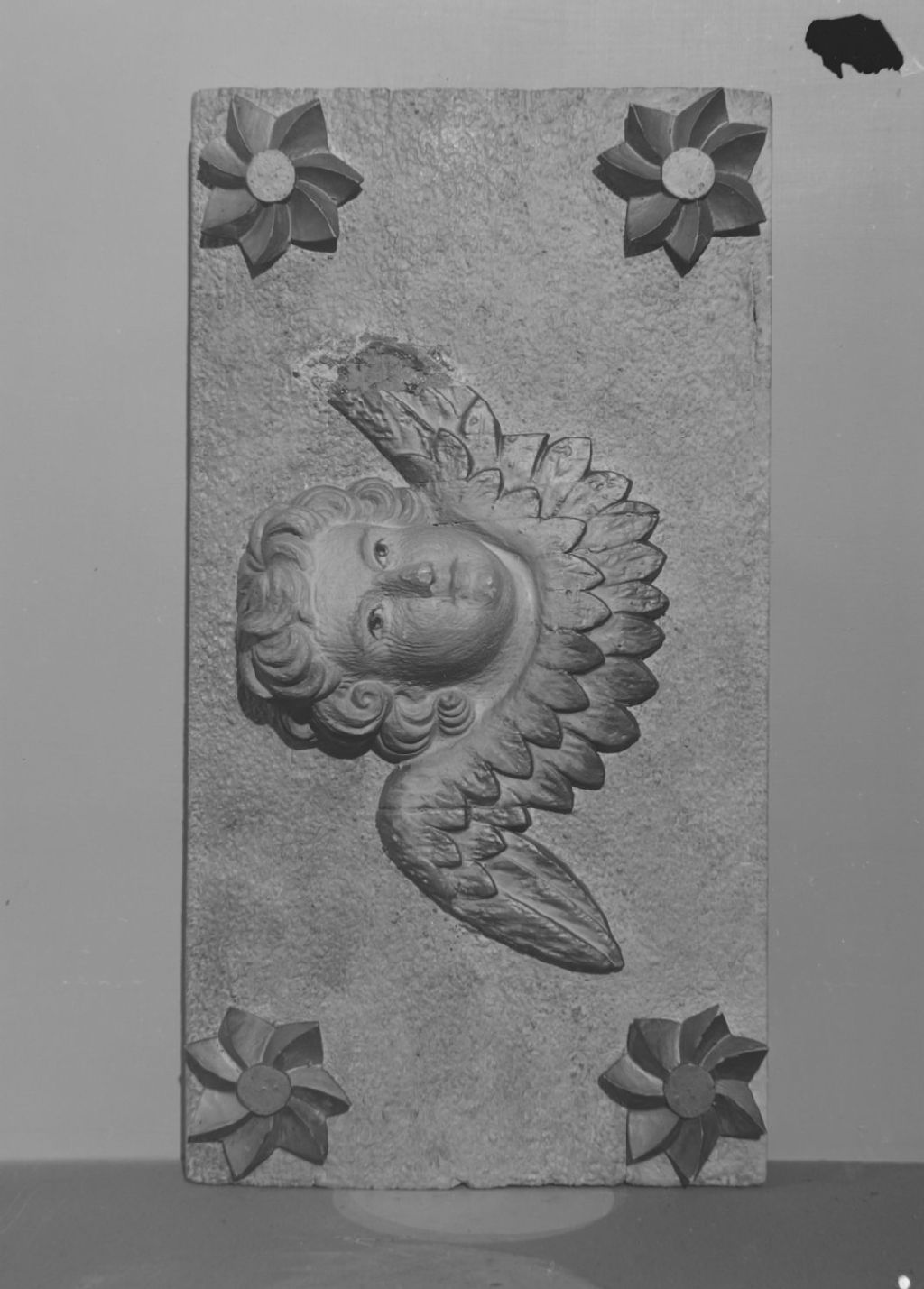 Montréal, île de Montréal - École du Meuble (Collection Paul Gouin) - Panneau décoratif en bois avec tête d'ange ailée et quatre rosettes dorées