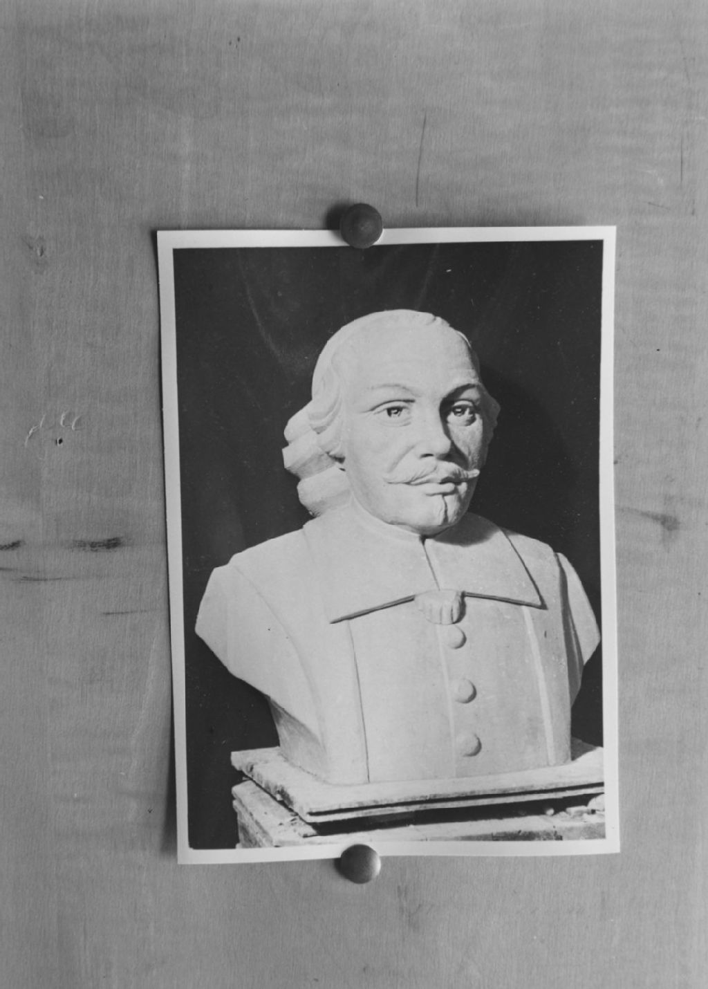 Montréal, île de Montréal - Hôpital Hôtel-Dieu - Buste en pierre de M. de La Dauversière, [1947], Archives nationales à Québec, Fonds ministère de la Culture et des Communications, (03Q,E6,S8,SS1,SSS633,D2955), Gérard Morisset.