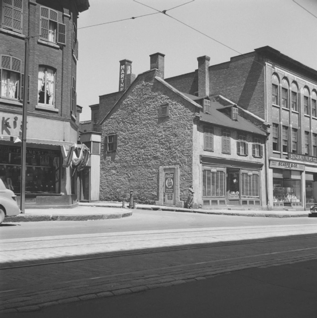 Montréal, île de Montréal - Maisons - Ancienne habitation de ferme près de l'édifice de la Gazette, [1948], Archives nationales à Québec, Fonds ministère de la Culture et des Communications, (03Q,E6,S8,SS1,SSS646,D3435), Gérard Morisset.
