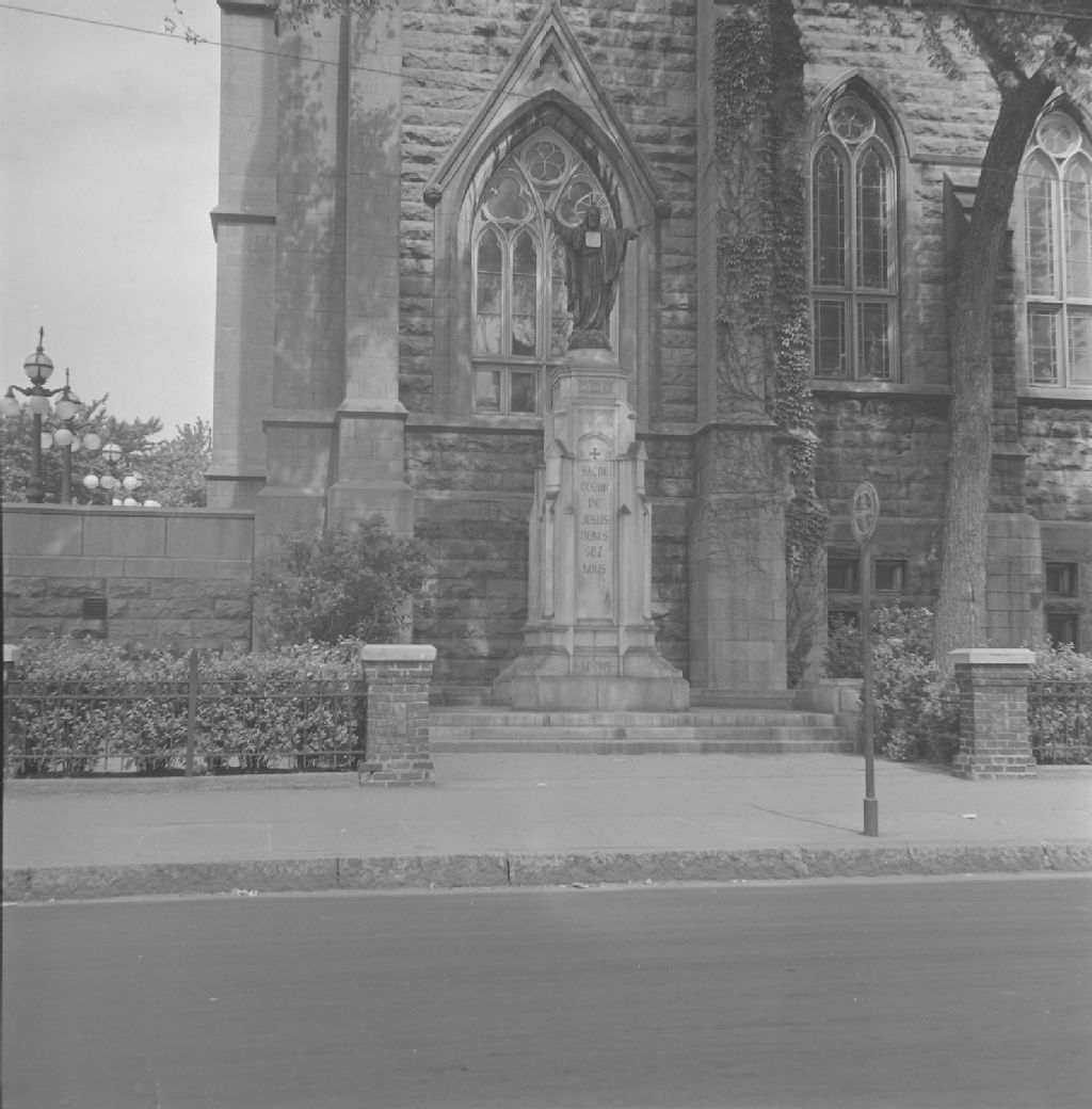 Montréal. Île de Montréal - Église Saint-Édouard - Extérieur et monument élevé au Sacré-Coeur-de-Jésus, [Vers 1947-1950], Archives nationales à Québec, Fonds ministère de la Culture et des Communications, (03Q,E6,S8,SS1,SSS687,D4136), Edgar Gariépy, Gérard Morisset.