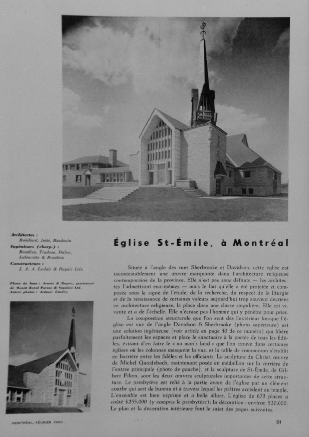 - Église construite en 1954 d'après les plans de Robillard, Jetté et Baudouin