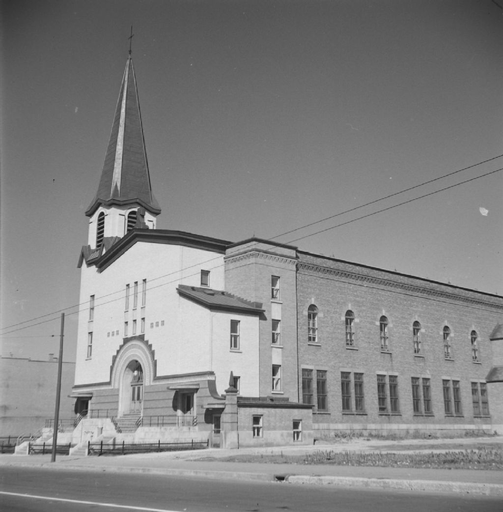 Montréal. Île de Montréal - Église Saint-Étienne - Extérieur, [1949], Archives nationales à Québec, Fonds ministère de la Culture et des Communications, (03Q,E6,S8,SS1,SSS688,D4144), Gérard Morisset.
