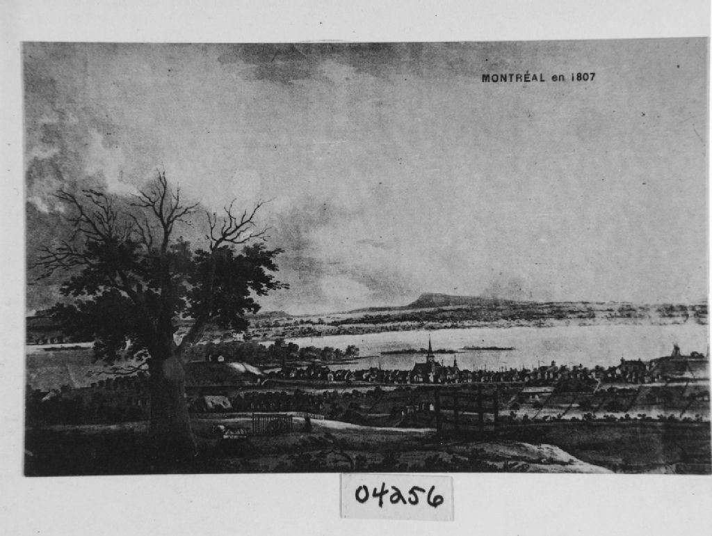 Montréal. Île de Montréal - Vieux-Montréal - La ville vue du Mont-Royal vers 1805, Vers 1950, Archives nationales à Québec, Fonds ministère de la Culture et des Communications, (03Q,E6,S8,SS1,SSS704,D4256), Photographe non identifié.
