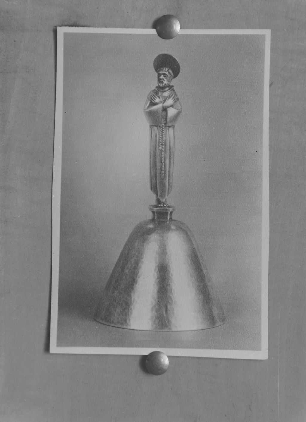 Outremont. Île de Montréal - Collection Gilles Beaugrand - Cloche en argent dont la poignée est un saint François en extase, 1945, Archives nationales à Québec, Fonds ministère de la Culture et des Communications, (03Q,E6,S8,SS1,SSS712,D4365), Gérard Morisset.
