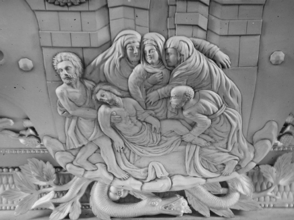 Pierrefonds. Île de Montréal - Église Sainte-Geneviève - Détail du tombeau du maître-autel, Vers 1950, Archives nationales à Québec, Fonds ministère de la Culture et des Communications, (03Q,E6,S8,SS1,SSS717,D4427), Photographe non identifié.