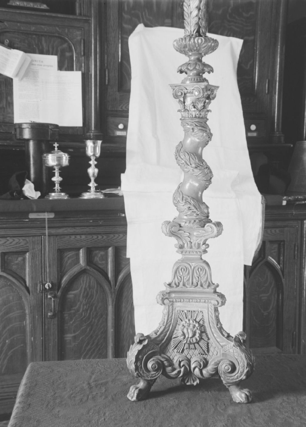 Pointe-Claire. Île de Montréal - Église - Chandelier de bois sculpté et doré transformé en patère, Vers 1950, Archives nationales à Québec, Fonds ministère de la Culture et des Communications, (03Q,E6,S8,SS1,SSS723,D4480), Photographe non identifié.