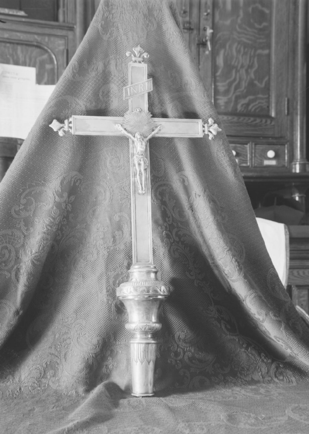 Pointe-Claire. Île de Montréal - Église - Croix de procession en argent massif, Vers 1950, Archives nationales à Québec, Fonds ministère de la Culture et des Communications, (03Q,E6,S8,SS1,SSS723,D4481), Photographe non identifié.