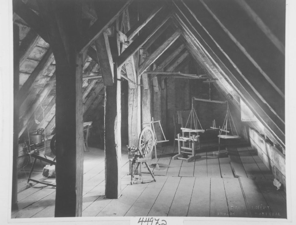 Pointe-Saint-Charles. Île de Montréal - Maison de la ferme Saint-Gabriel - Le deuxième grenier, Vers 1950, Archives nationales à Québec, Fonds ministère de la Culture et des Communications, (03Q,E6,S8,SS1,SSS726,D4497.2), Edgar Gariépy.