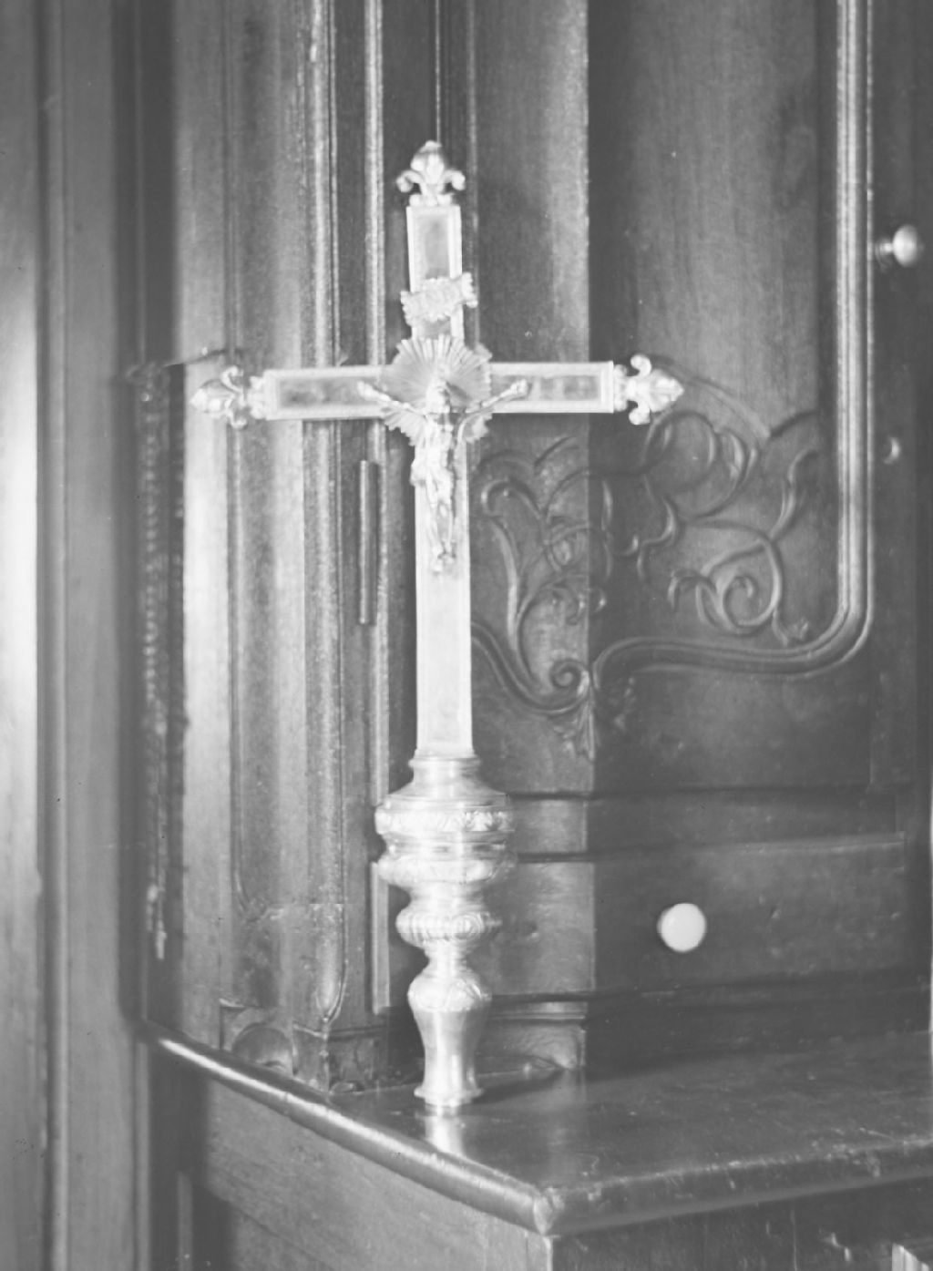 Saint-Laurent. Île de Montréal - Église - Croix de procession en argent massif, Vers 1950, Archives nationales à Québec, Fonds ministère de la Culture et des Communications, (03Q,E6,S8,SS1,SSS735,D4544), Photographe non identifié.