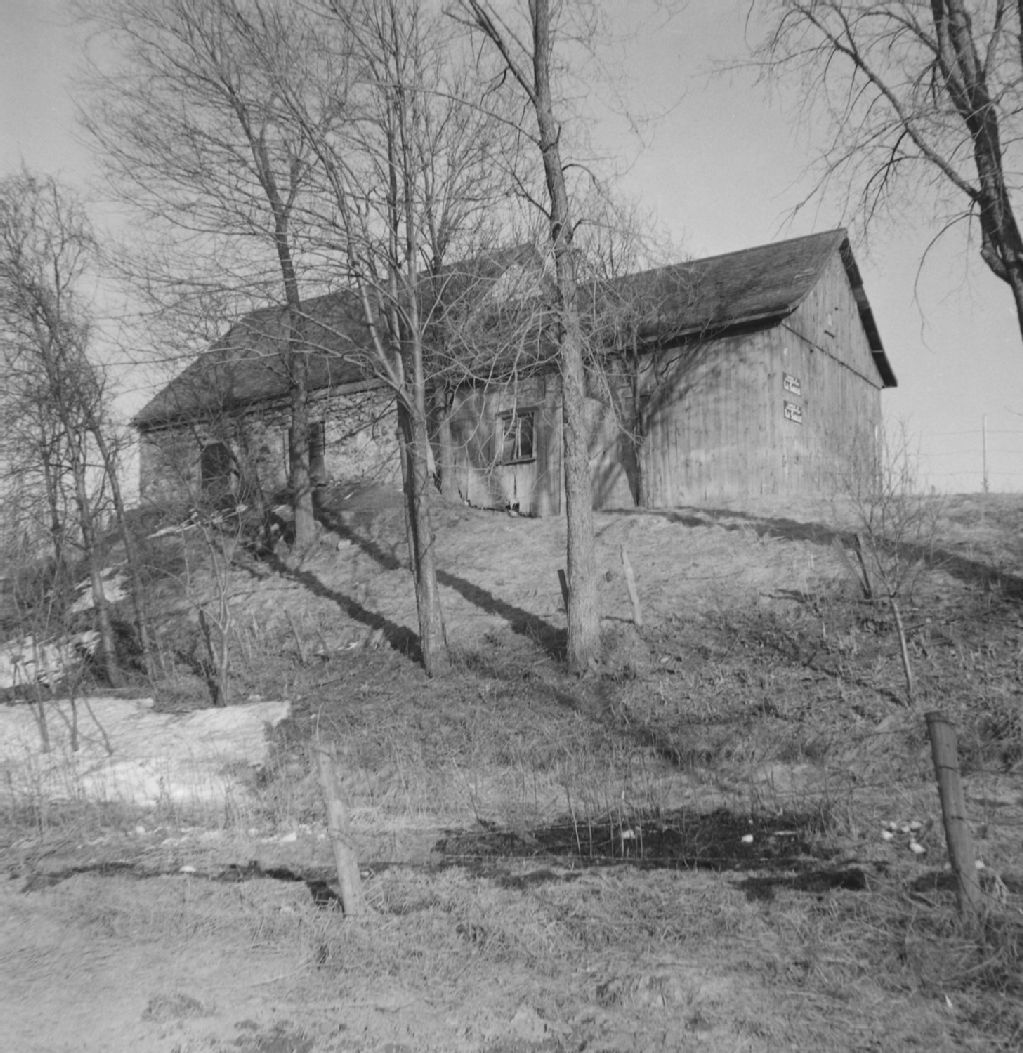 Sault-au-Récollet. Île de Montréal - Maisons - Habitation en pierre et remise en bois sur un coteau à l'est du village, 1947, Archives nationales à Québec, Fonds ministère de la Culture et des Communications, (03Q,E6,S8,SS1,SSS747,D4643), Gérard Morisset.