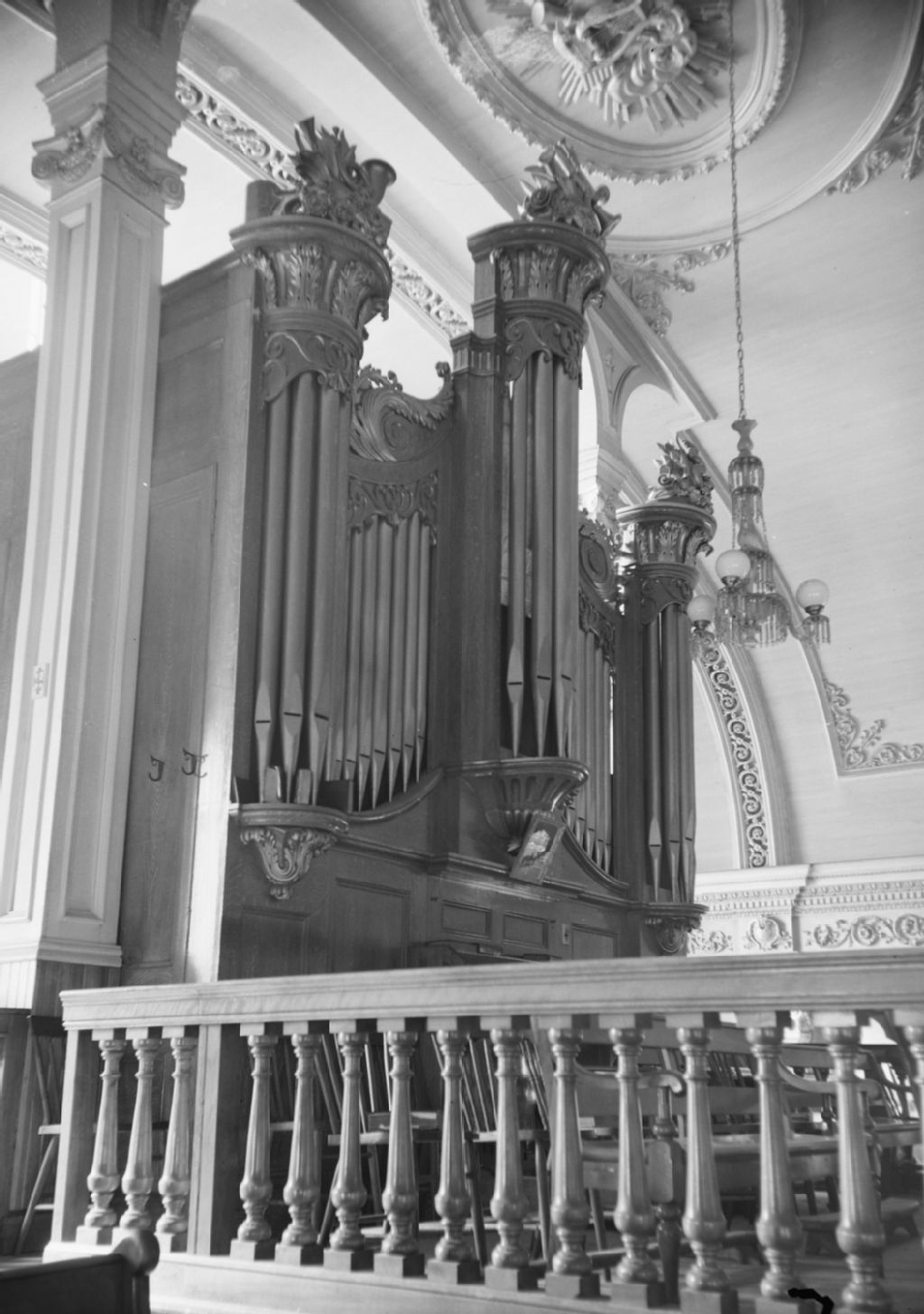 Kamouraska, Kamouraska - Église - Buffet de l'orgue en bois sculpté, 1945, Archives nationales à Québec, Fonds ministère de la Culture et des Communications, (03Q,E6,S8,SS1,SSS807,D5048), Gérard Morisset.