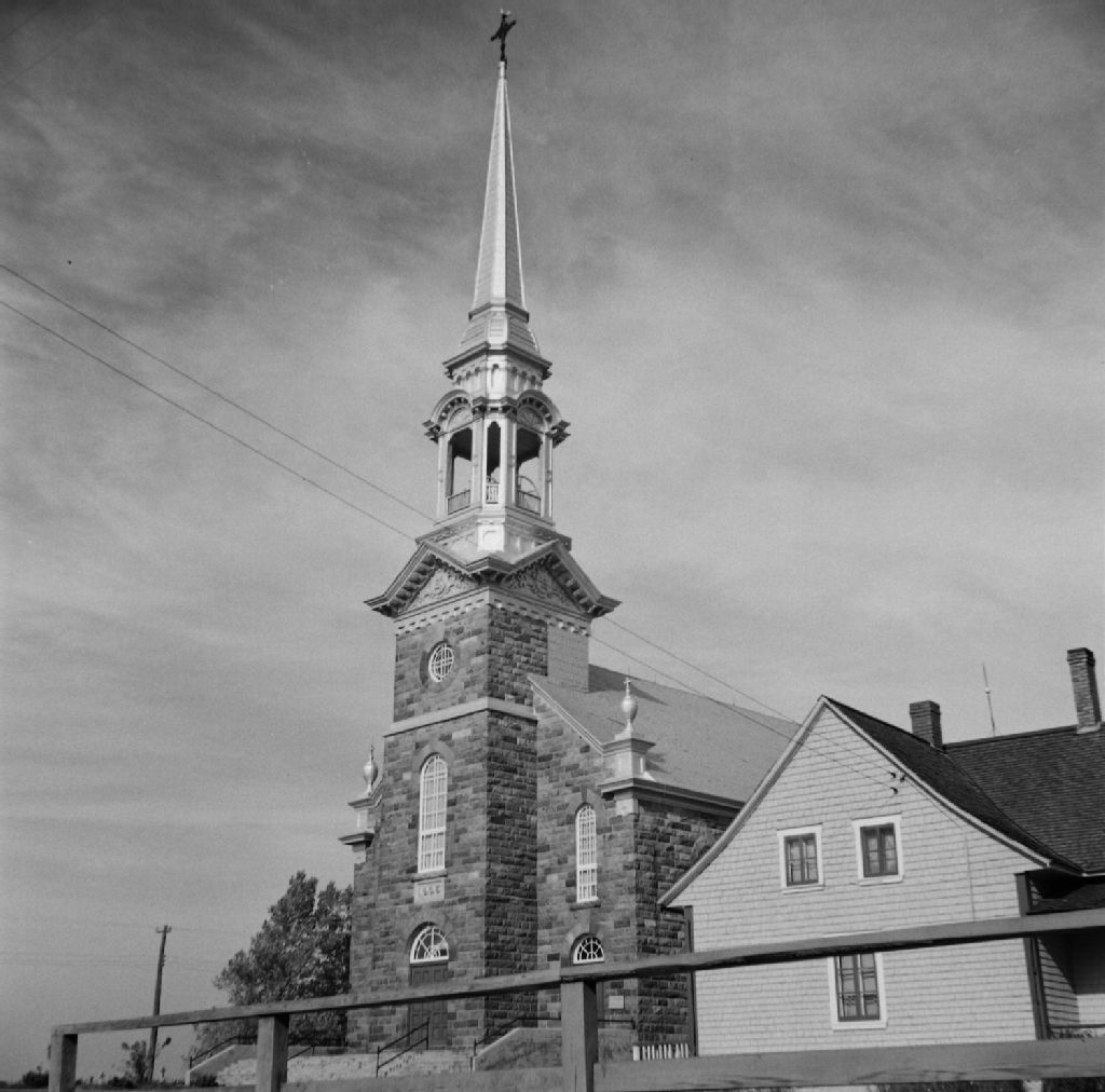 Mont-Carmel, Kamouraska - Église - Extérieur, 1947, Archives nationales à Québec, Fonds ministère de la Culture et des Communications, (03Q,E6,S8,SS1,SSS816,D5104), Gérard Morisset.