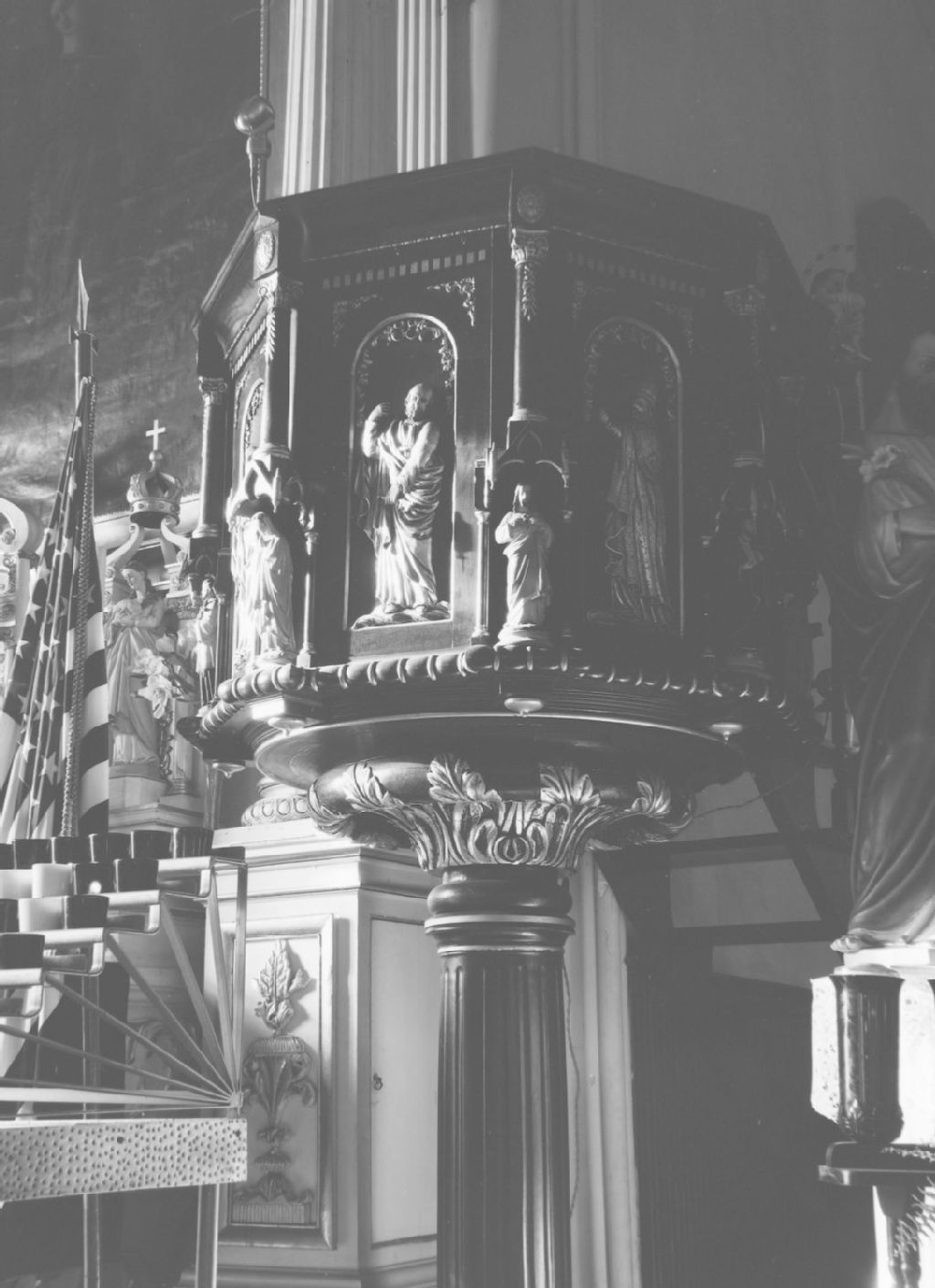 Caughnawaga, Laprairie - Église - Chaire, 1945, Archives nationales à Québec, Fonds Ministère de la Culture et des Communications, (03Q,E6,S8,SS1,SSS865,D5279), Gérard Morisset.