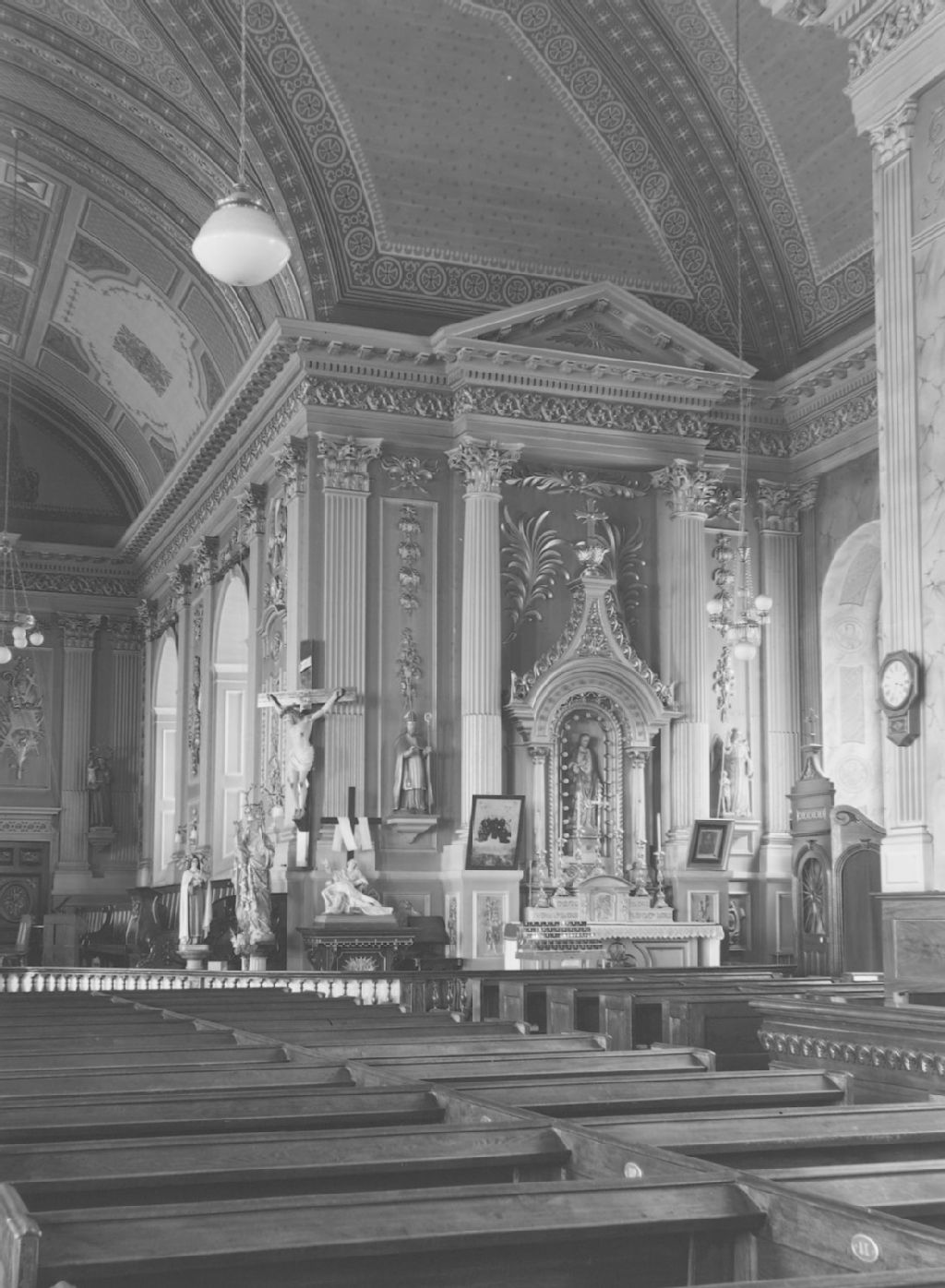Retable par Louis-Xavier Leprohon, 1827. Autel et ornements additionnels (palmes) par Ferdinand Villeneuve, 1872