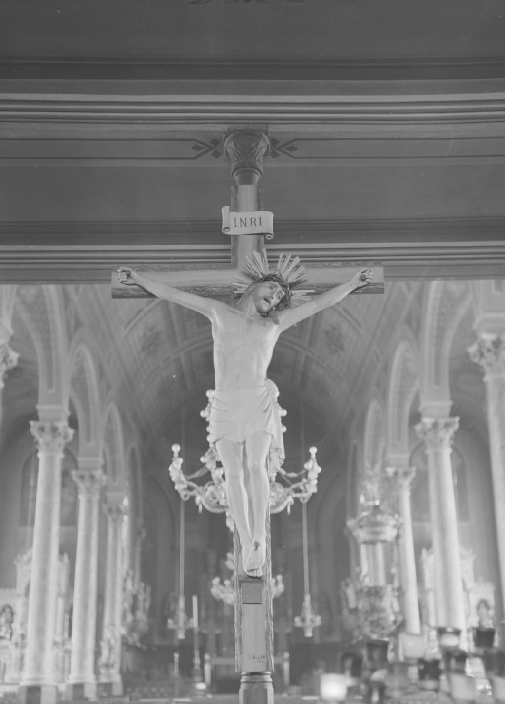 Saint-Romuald, Lévis - Église - Christ en croix en bois peint au naturel, 1945, Archives nationales à Québec, Fonds ministère de la Culture et des Communications, (03Q,E6,S8,SS1,SSS950,D5934), Gérard Morisset.