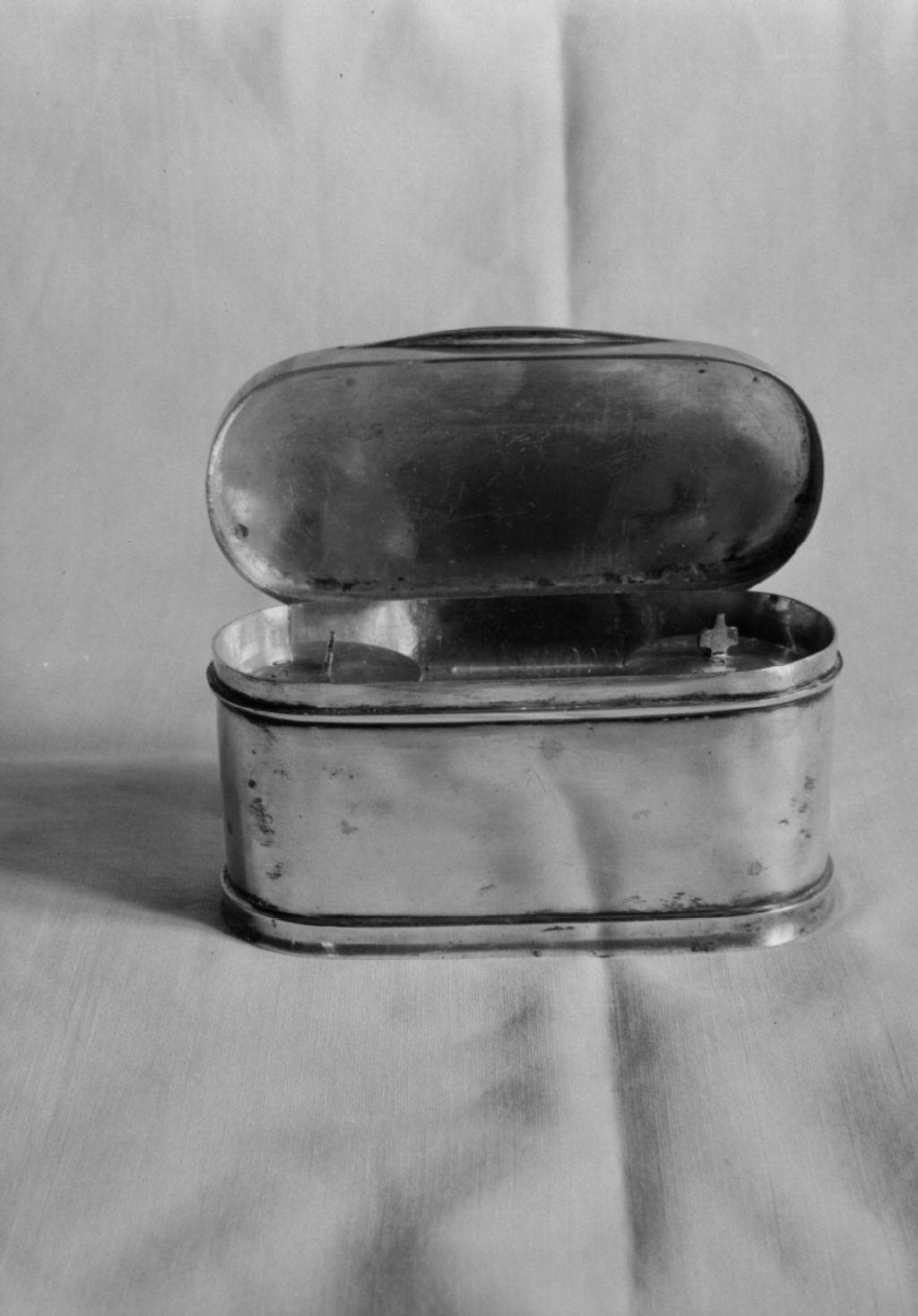 Deschaillons, Lotbinière - Église - Boîtier aux saintes huiles en argent massif, 1944, Archives nationales à Québec, Fonds ministère de la Culture et des Communications, (03Q,E6,S8,SS1,SSS975,D6153), Gérard Morisset.