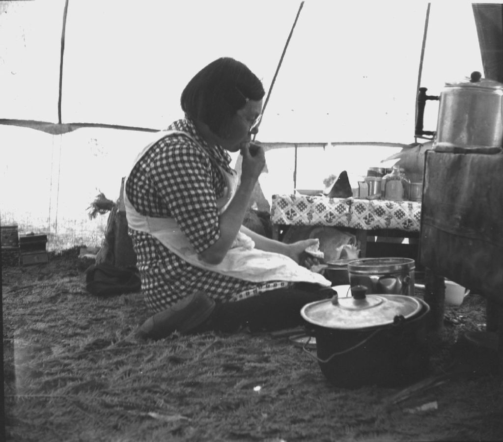 Madame Charles Fontaine en train de manger dans sa tente, [1937?], Archives nationales à Québec, Fonds Ministère de la Culture et des Communications, (03Q,E6,S9,P121), Paul Provencher.