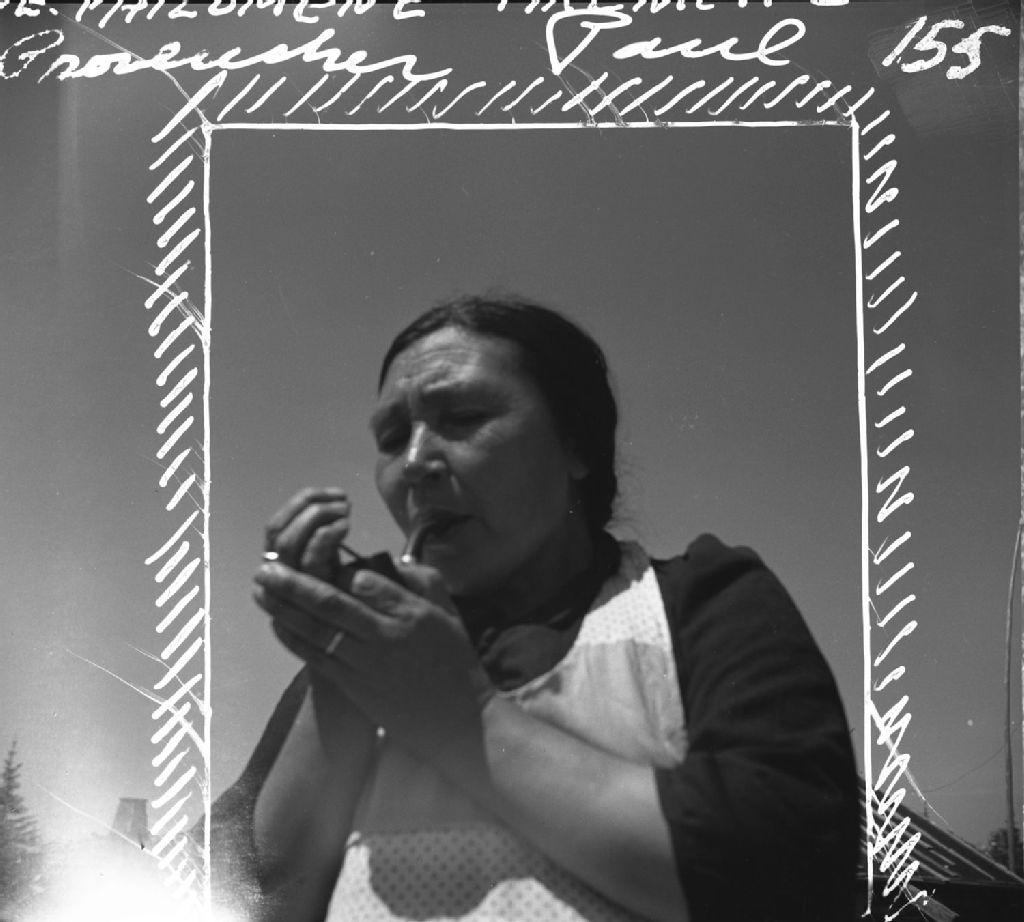 La veuve Philomène Tireniche, Montagnaise de Sept-Îles, allumant sa pipe, 1942, Archives nationales à Québec, Fonds Ministère de la Culture et des Communications, (03Q,E6,S9,P155), Paul Provencher.