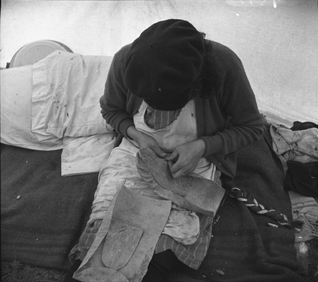 Texte tiré des propos de Paul Provencher :[Mme Simon Jourdain, Montagnaise de Bersimis, cousant le soulier mou en peau de caribou à Manicouagan]. Détail du plissage du soulier mou montagnais