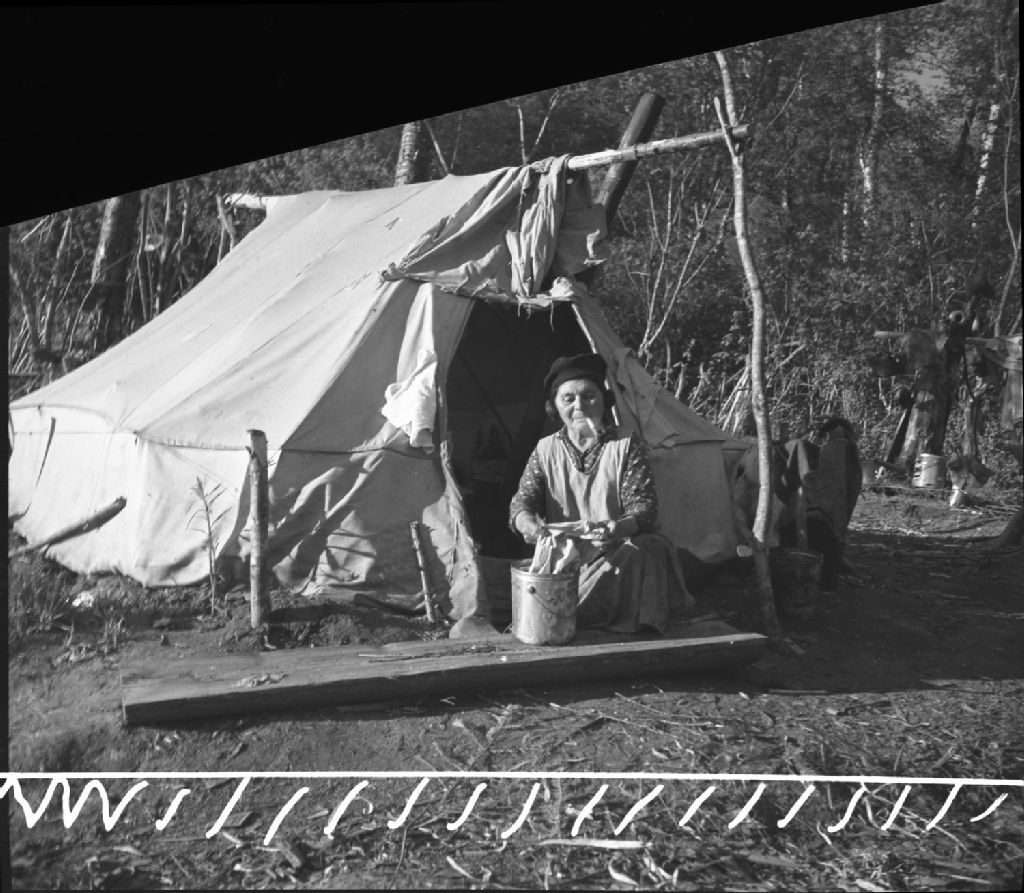 Texte tiré des propos de Paul Provencher :Mme Joseph Desterres fait le lavage des poches de farine devant sa tente en fumant sa pipe. Montagnaise de Bersimis