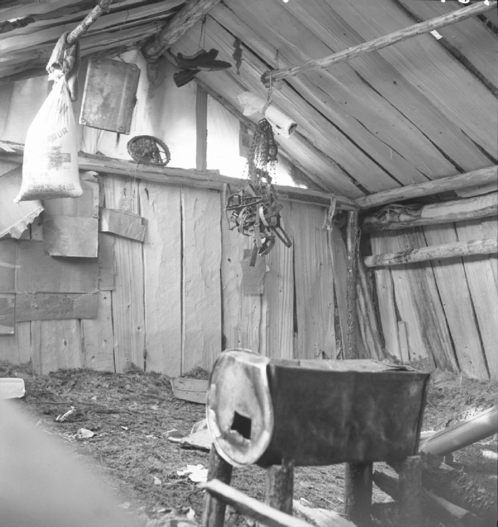 Texte tiré des propos de Paul Provencher :L'intérieur du camp. La charpente est de bois rond et les murs et la toiture est de madriers obtenus de billots de fort diamètre, fendus à la hache au moyen de coins et placés côte à côte sur la verticale. Le poêle provient d'un baril vide de gazoline. Ce camp était utilisé par des montagnais provenant de la rivière Ste-Marguerite. (1950)