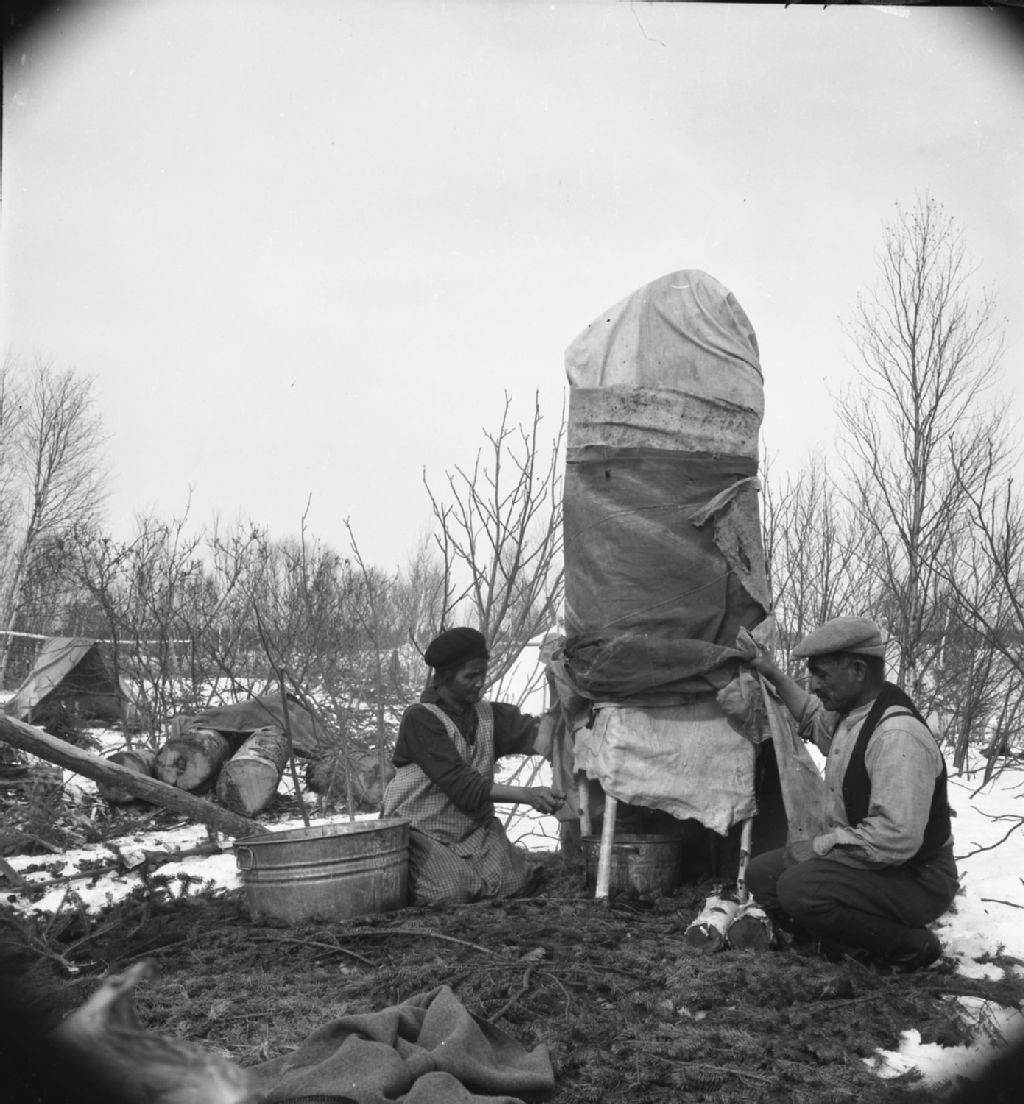 Texte tiré des propos de Paul Provencher :Le père et la mère Picard sont allés faire la cueillette de souches de bouleaux pourries dont les morceaux sont écrasés et plus ou moins pulvérisés dans le but de les jeter sur des tisons recueillis dans leur poêle de tôle. La fumée remplie d'acide tannique, tannera la peau assouplie enroulée autour de la tour à fumer recouverte de toile, ainsi tanné, le cuir restera souple et ne pourrira pas