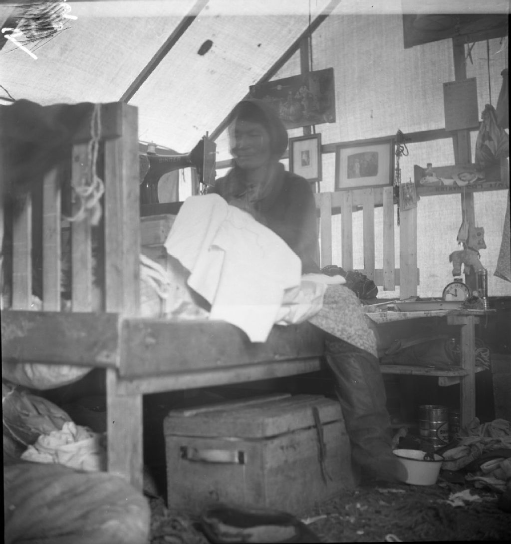 Texte tiré des propos de Paul Provencher :Ceux qui ont fait une bonne chasse se procurent une machine à coudre, chez quelques Naskapis de Fort Mackenzie, juillet 1941. Ici Mme Johnny Schaal
