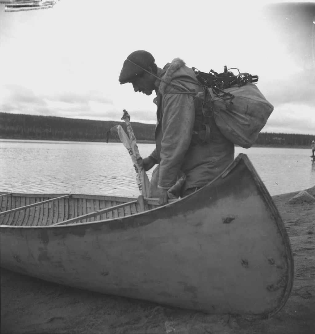 Texte tiré des propos de Paul Provencher :Un trappeur Naskapis. À remarquer comment la pince de son canot est faite. Les deux côtés de la toile sont pressés ensemble entre les deux pièces de bois supplémentaires