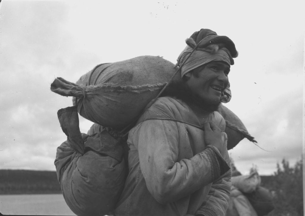 Texte tiré des propos de Paul Provencher :Le Naskapis est certainement aussi fort que le Montagnais; Ici la manière de portager 240 lbs. L'écorce protectrice montagnaise pour le dessus du crâne manque, mais la paire de bottes de loup-marin pliée en deux la remplace