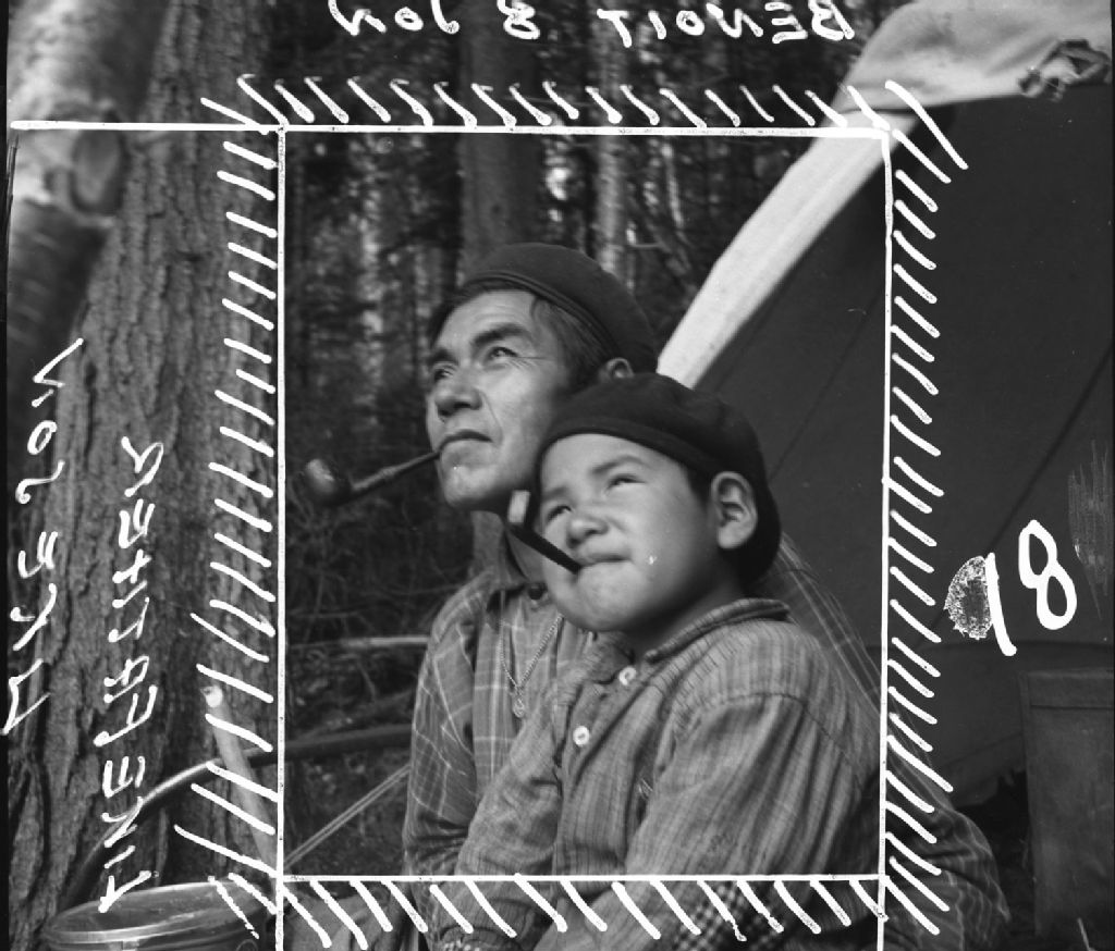 Texte tiré des propos de Paul Provencher :Père et fils, gros plan de Joseph Benoît Montagnais de Bersimis et de son fils de cinq ans fumant la pipe devant leur tente à la rivière Toulnoustook en 1934. [1939]