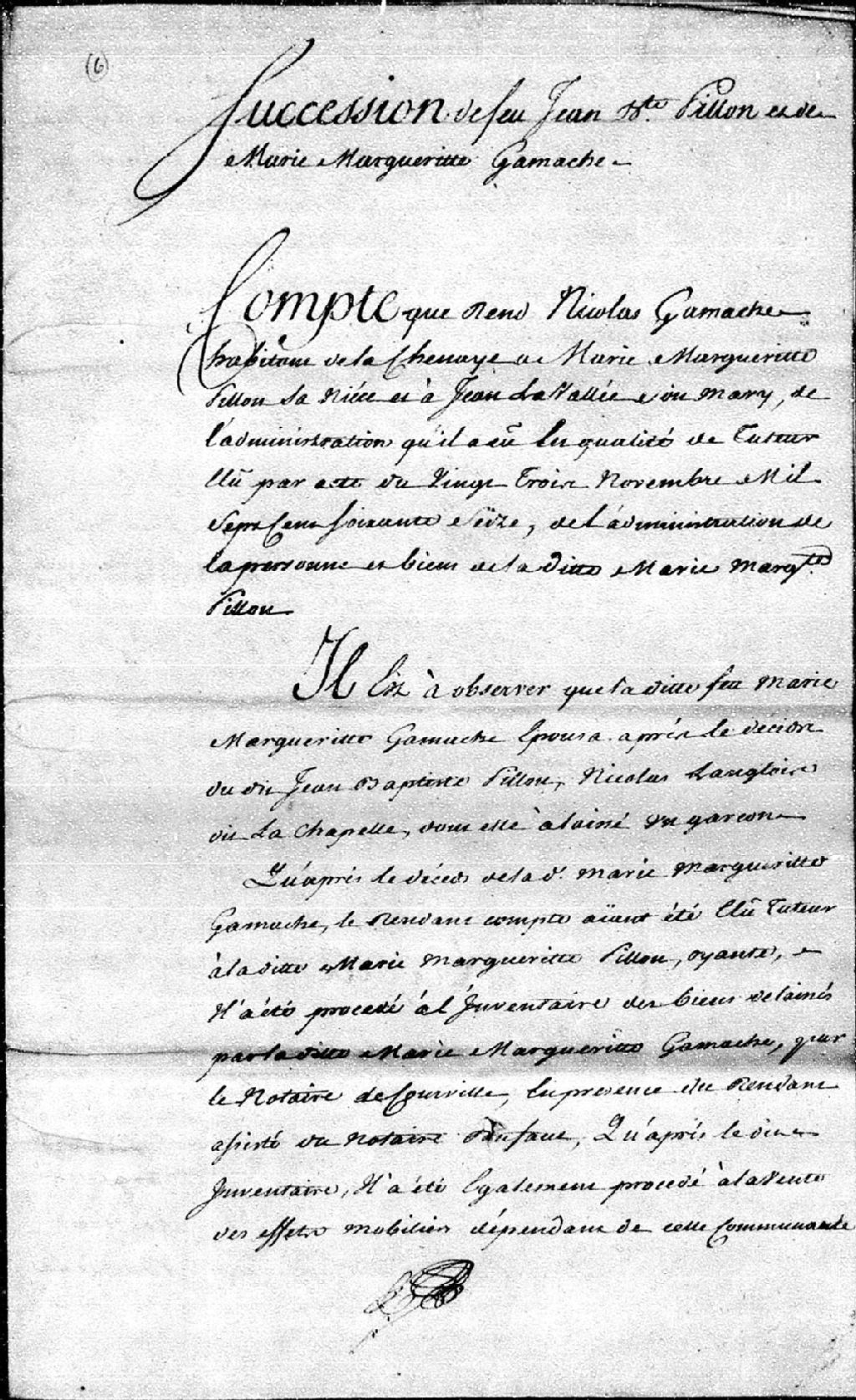 - Document faisant état de la succession de feu Jean-Baptiste Pillon et de Marie-Marguerite Gamache, 27 novembre 1779