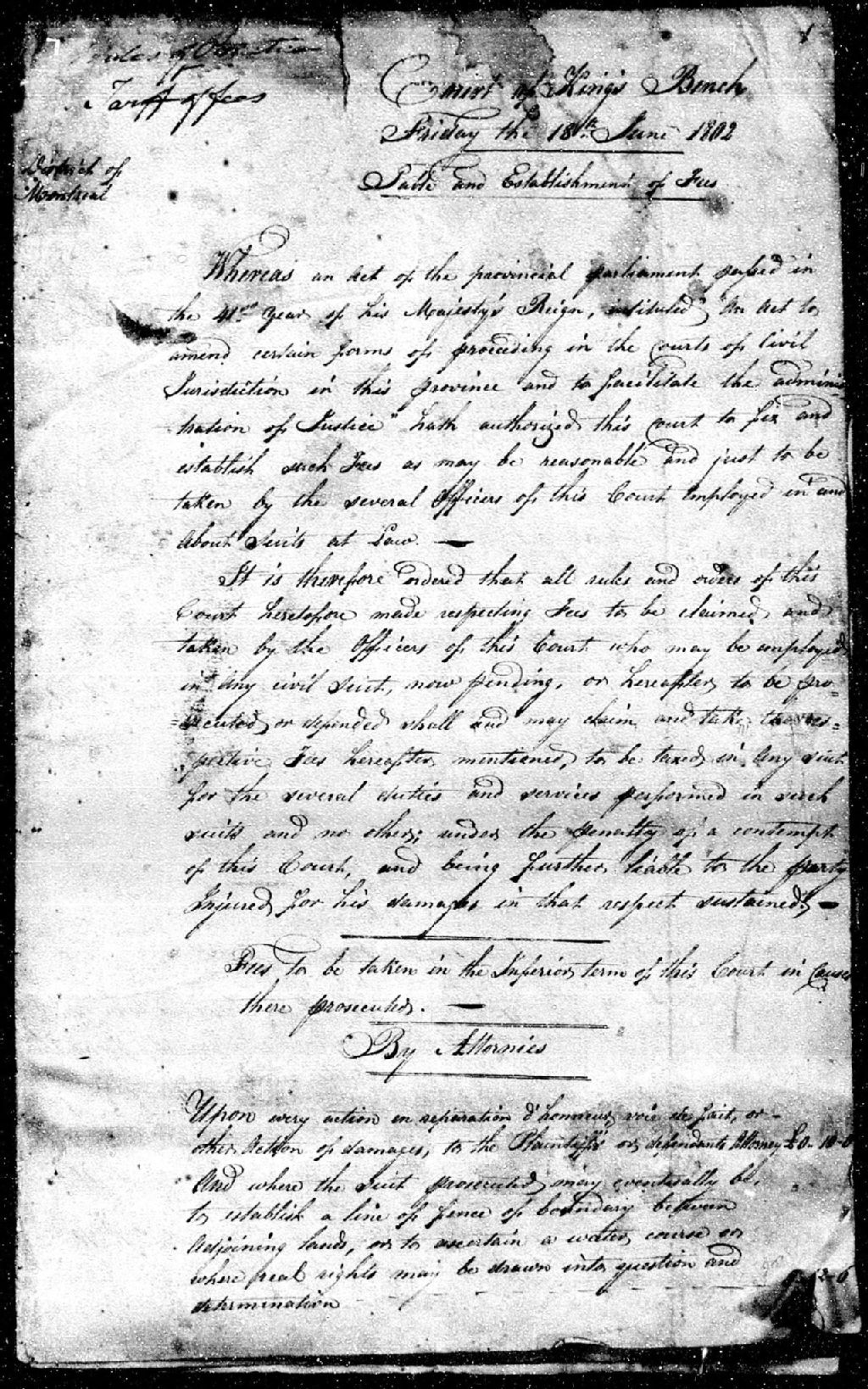 Règlement sur la tarification pratique des officiers de la Cour du Banc du Roi, 18 juin 1802 et 20 février 1815