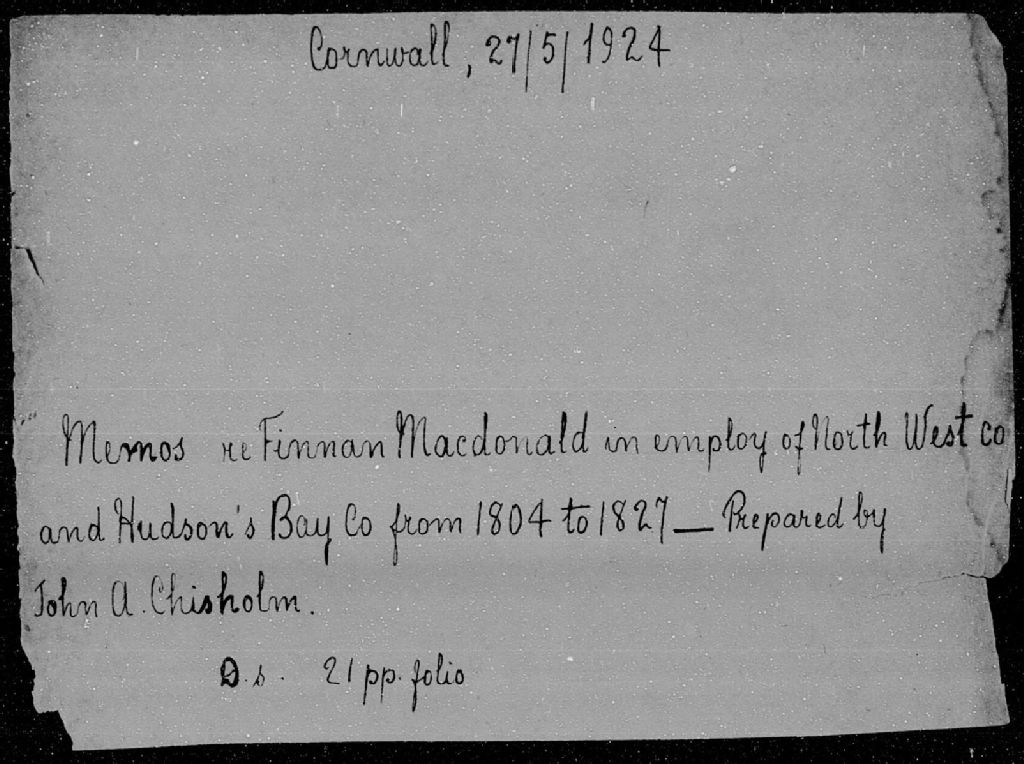 Mémo adressé à Aegidius Fauteux par John A. Chishlom et portant sur monsieur Finnan McDonald, qui fut à l'emploi de la North West Company et de la Hudson's Bay Company de 1804 à 1827, Cornwall, 27 mai 1924