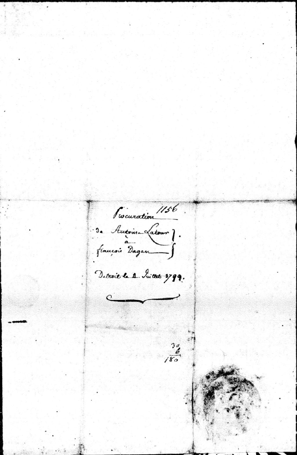 - Procuration de Antoine Latour à François Dagen concernant l'argent que Antoine Denoyau dit Laframboise devait à Antoine Latour, Détroit, 4 juillet 1799
