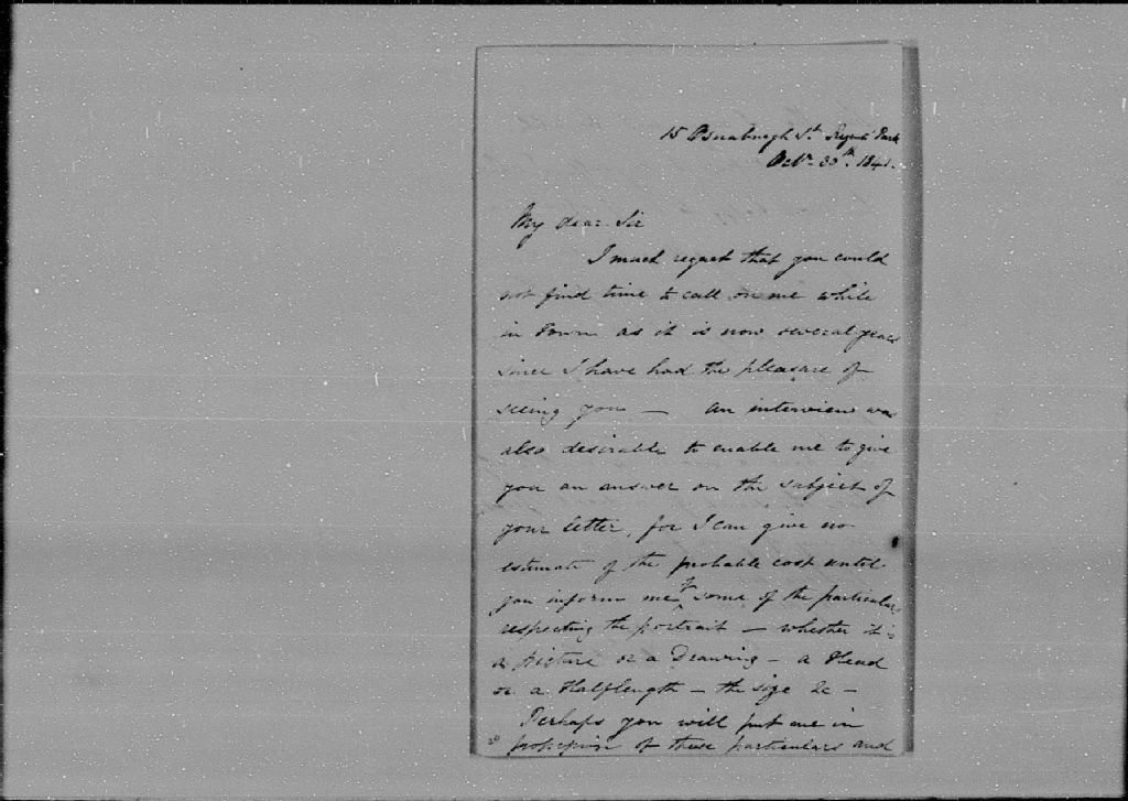 - Lettre à un correspondant non identifié demeurant à Regents' Park, le 30 octobre 1841, concernant la production d'une peinture commandée par Samuel Cousins