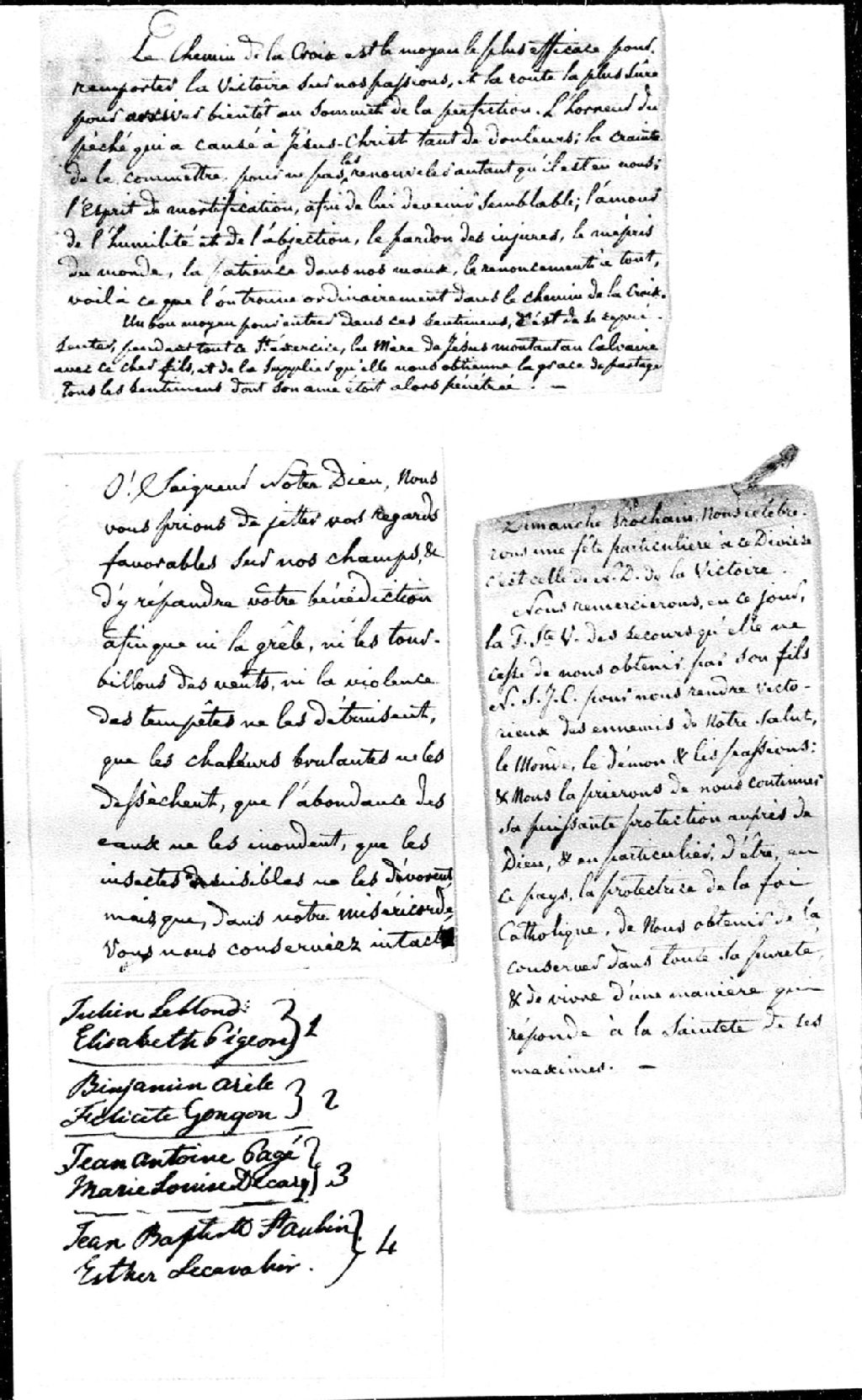 - Lettre du prêtre Houdet concernant l'histoire d'une poule conservée comme pièce à conviction à un procès, 1823; pensées religieuses; listes incomplètes de mariages et de décès; [ca 1840]; document relatif au pouvoir religieux, [ca 1850]; document relatif à des procédures judiciaires