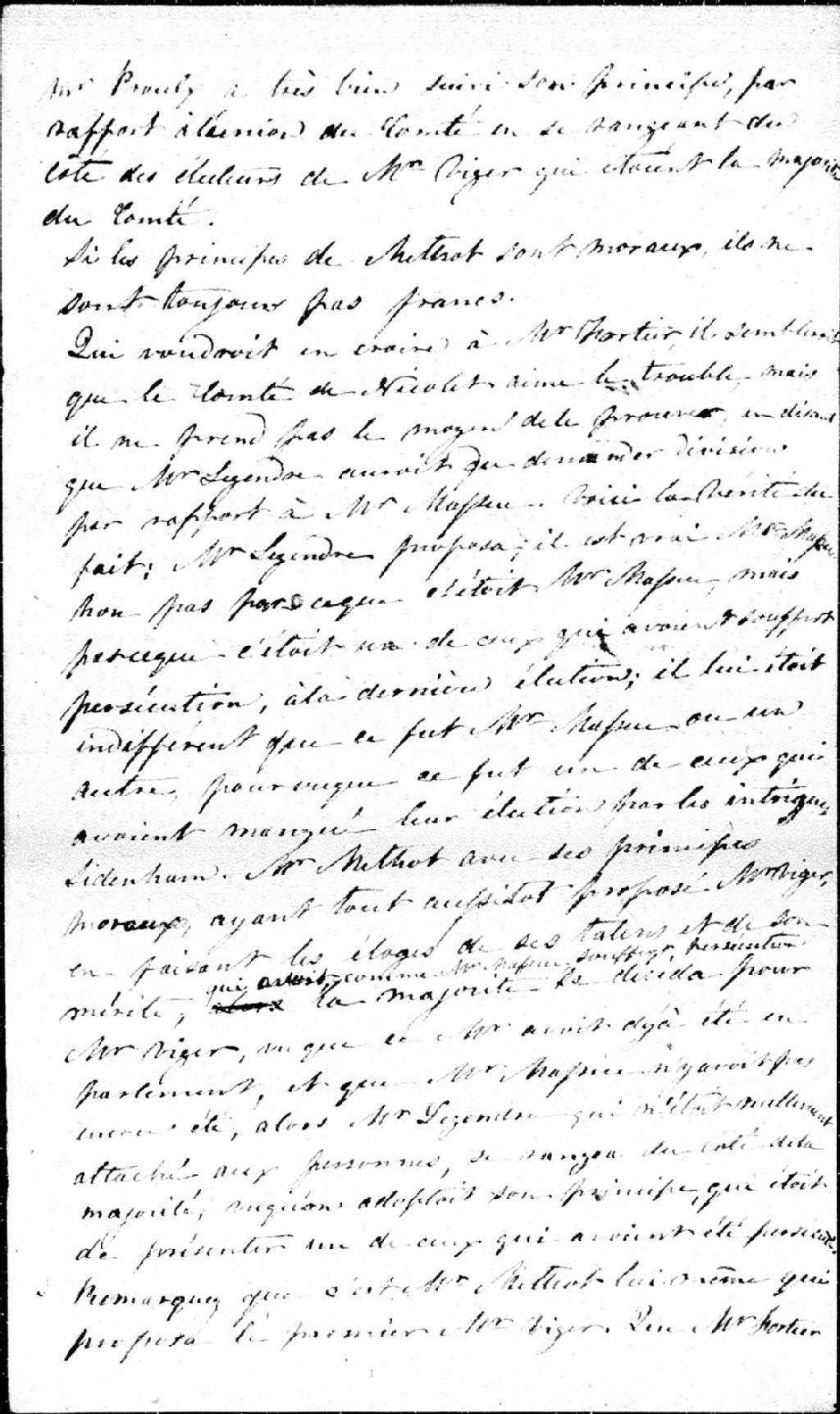 - Document manuscrit concernant une élection dans le comté de Nicolet. Les personnes mentionnées dans ce document sont messieurs Fortier, Legendre, Massue, Methot, Proulx et D.B. Viger, 1844
