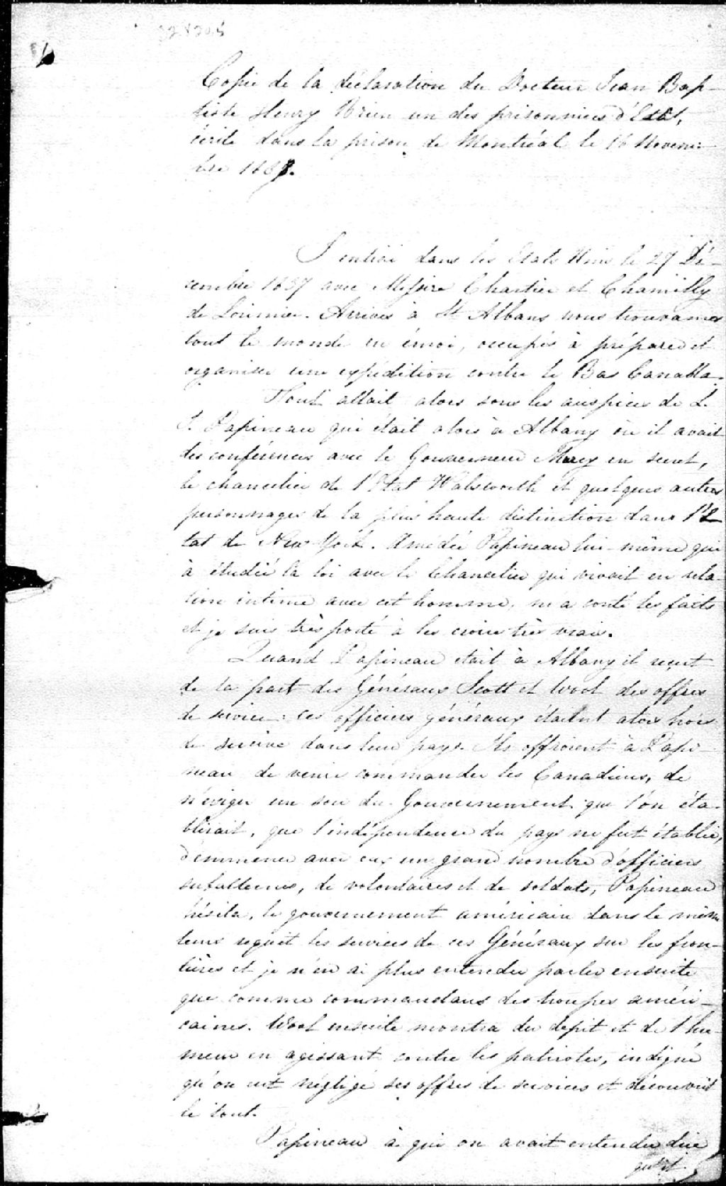 - Copie de la déclaration du docteur Jean-Baptiste-Henry Brien, l'un des prisonniers d'État lors de la Rébellion de 1837, écrite dans la prison de Montréal le 16 novembre 1838