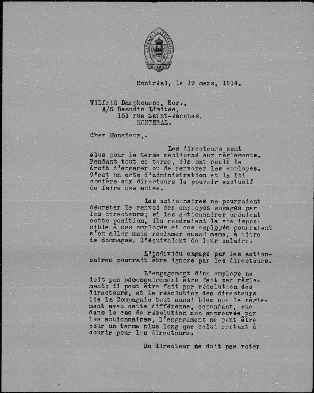 - Lettre de Séverin Létourneau à Wilfrid Damphousse au sujet de l'engagement de certaines personnes, Montréal, 19 mars 1914