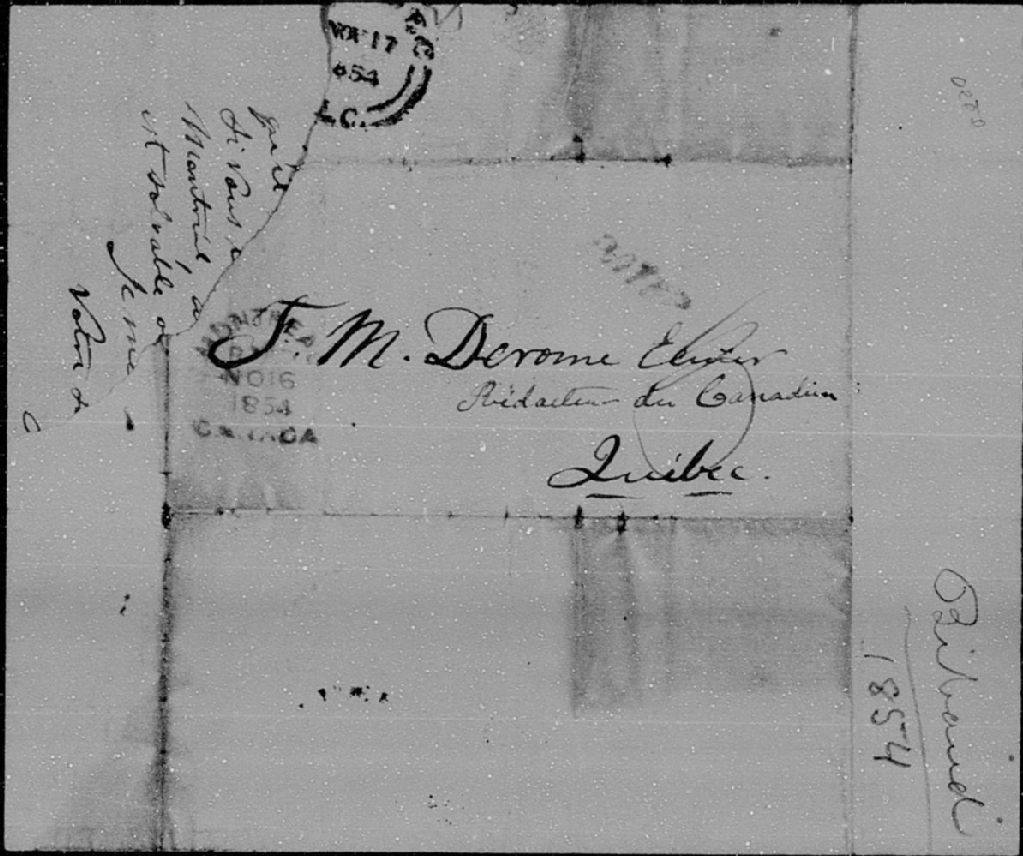 Lettre de J.-O.-E. Bibaud à F.-M. Derome, Montréal, 15 novembre 1854